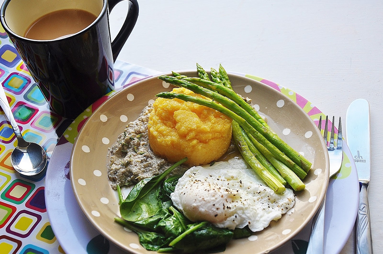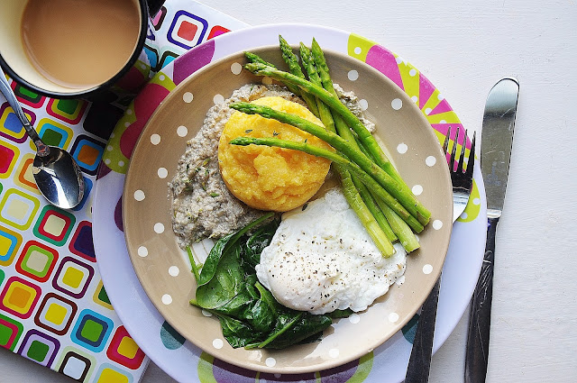 Polenta with Spinach, Asparagus, Mushroom Sauce, and a Poached Egg
