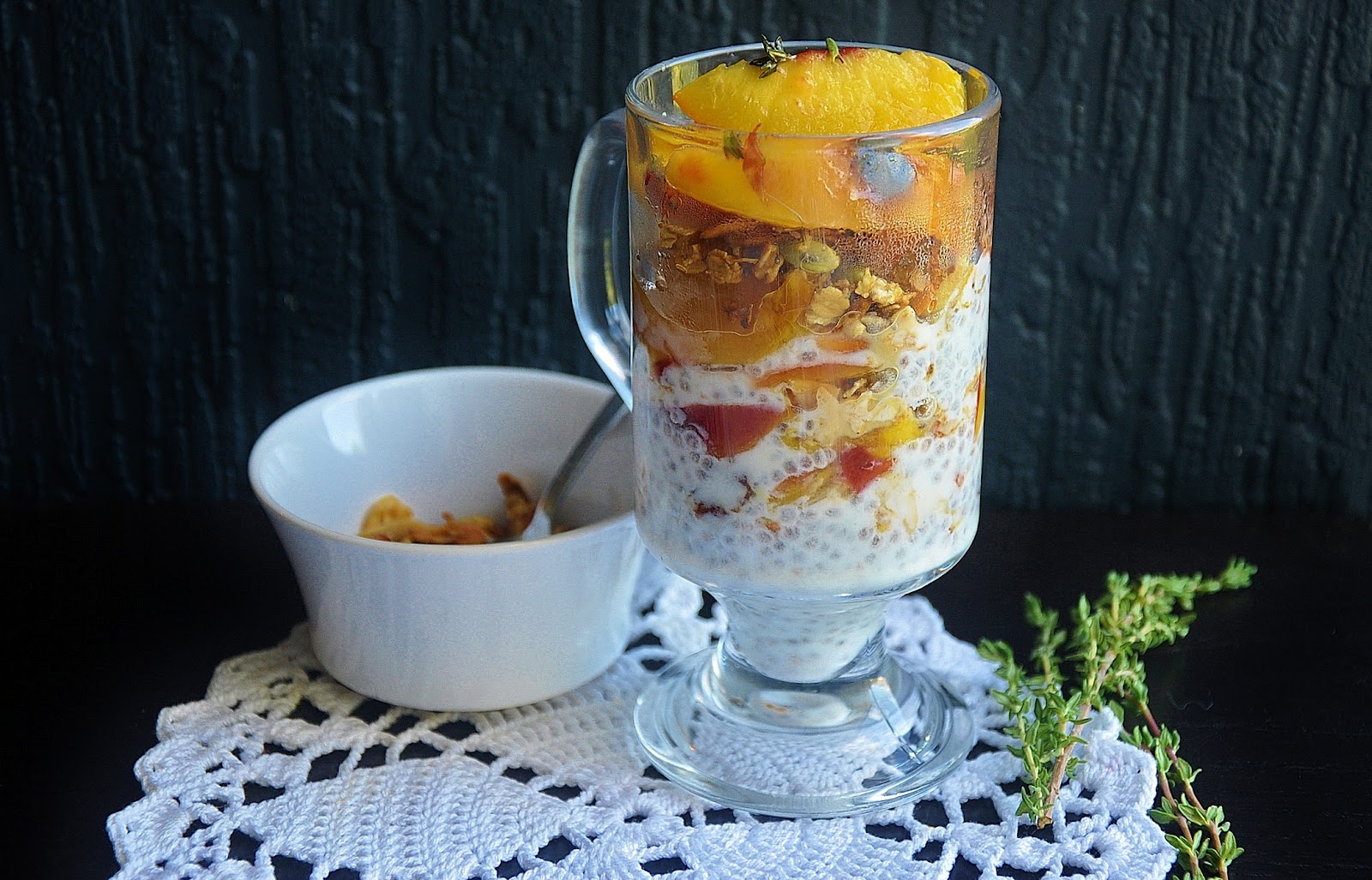 The full title of this post should read "Chia Seed, Yoghurt and Honey Parfait with Homemade Granola and Thyme roasted Peach".